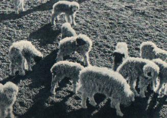 宁夏回族自治区滩羊主要产地之一的盐池县滩羊选育场,为了进一步提高滩羊质量,争取羊只丰收,领导干部、技术人员和牧工,在接羔季节到来之前,就对保胎、接羔和育羔工作进行了详细的研究和安排。因此,羊羔成活率较高,而且生长良好。图为牧工们在摸胎,检查下羔前情况。(1962年)
