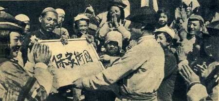 拉东村人民给军属李承统送“保家卫国”的光荣匾。
