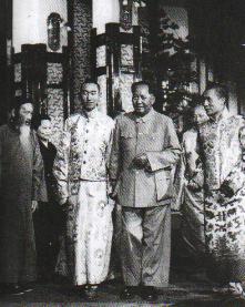 1954年9月,毛泽东在中南海勤政殿接见达赖(右)和班禅(左)。