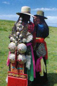 藏族女子的马尔盾头饰。海西草原上,藏族女子年至15岁便开始佩戴发套“马尔盾”,这是青海地区藏族女子头饰中最有代表性的一种。“马尔盾”用布或绸缎作衬底,其上缀有银盾、蚌壳、珊瑚、松石、银币等物,下端垂有一排丝穗。银盾是“马尔盾”最醒目的装饰,由大到小排列在绸布衬底上,小者如酒盅,大者如汤碗,数目多达几十个,重约二十余斤。佩戴时从头披至脚跟。“马尔盾”头饰的上段分为三部分,中间的发套挂在头顶的小辫上;左右两侧挂在肩上与胸饰相连;下段宽大而沉重,用彩带系于腰间。像“马尔盾”这样的装饰物既可称作头饰,亦可称为背饰。