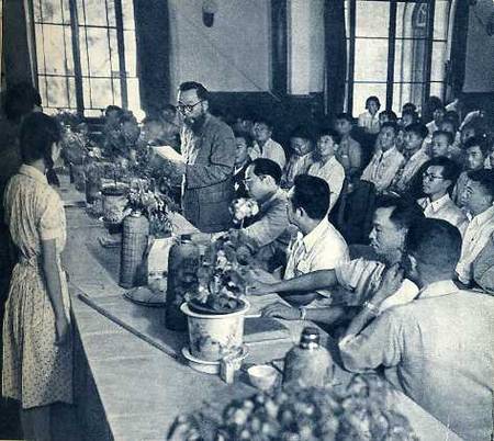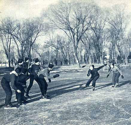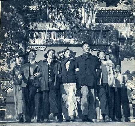 在1959年首都高等院校田径运动会上,我校获得男女总分第一。这是我校运动员在女子4x100米接力赛途中。