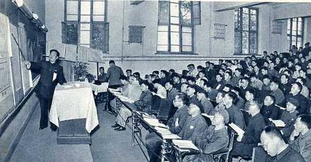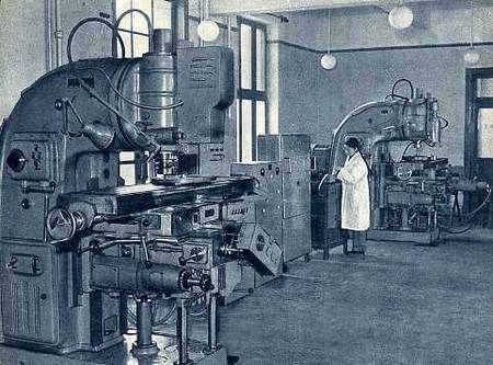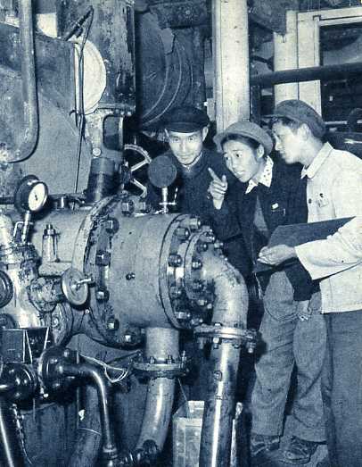 清华大学附设综合机械厂机装车间一角。学生正在这个用学校自制机床装备起来的车间里进行生产劳动。