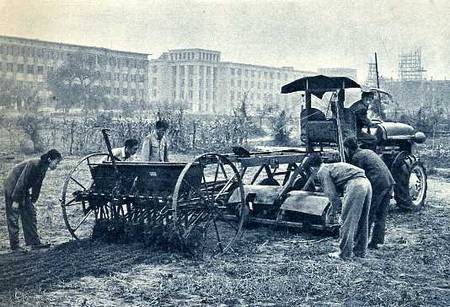 我校新设立的农业机械系师生设计的新型拖拉机正在进行试验。