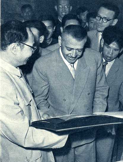 蒋南翔校长向1960年来校参观的阿尔巴尼亚国民议会主席列希赠送相册。