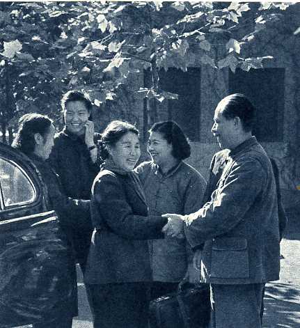 我校学生于1959年在中国人民政治协商会议礼堂举行汇报演出。这是周恩来总理在演出后接见我校学生演员。
