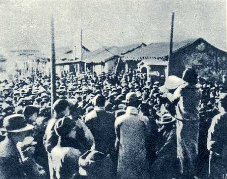 1935年“一二?九”运动中,清华学生在北京西直门外召开群众大会,宣传抗日救国。