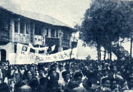 1947年“五?二0”运动中,清华学生高呼反饥饿反内战的口号参加示威游行。