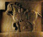 飒露紫—是唐武德四年(621年)李世民于洛阳会战王世充时的坐骑。刻有将军丘行恭为骏马拔箭的场面。现藏美国宾夕法尼亚大学。