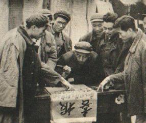 “亲爱的党,我们坚决响应了您的号召,提前111天跨进1960年了!”图为同志们在写喜报。