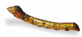 (汉)鎏金铜蚕。蚕长5.6厘米,腹围1.9厘米,胸高1.8厘米。通体鎏金,体态逼真,制作精致。目前国内仅此一件。