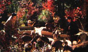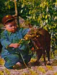 镇坪县养麝实验场已能成群地驯化和繁殖麝。图为工人在喂养麝群。(1973年)