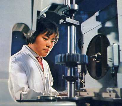 秦川机床厂生产的精密机床。这是工人正在测量新生产的机床齿轮的精度。