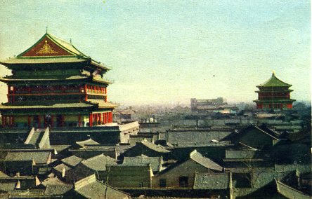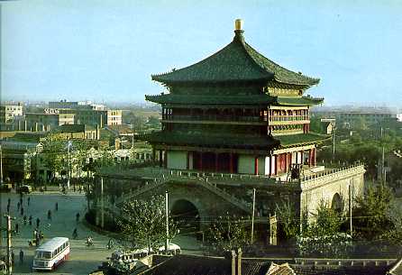 西安一角,明代(公元一三六八年——一六四四年)所建的钟楼。