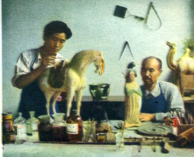 陕西省文物理管委员会的工作人员正在修整残破的出土文物。