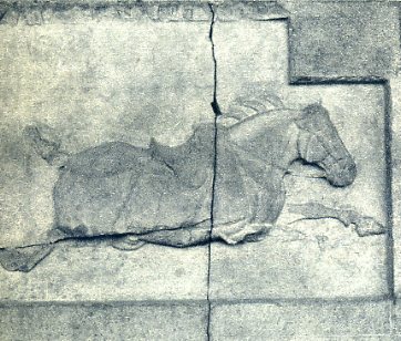 历史博物馆陈列的唐代浮雕“昭陵六骏”之一。六骏共有6块,各高4.5尺,宽5.5尺,厚1尺,其中有两块已在1914年被盗往美国,其余4块在盗运途中被西北人民发觉追回。盗运的人为了便于秘密装箱,曾把每块打成几块。