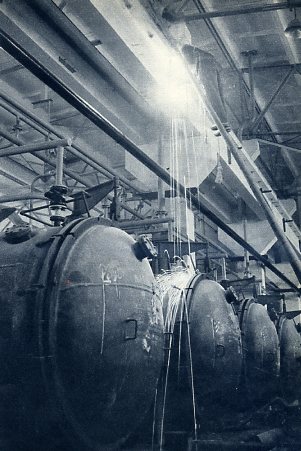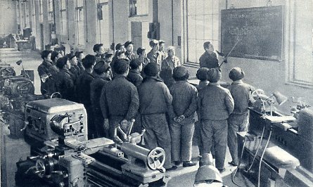 西安第一航空技工学校实行勤工俭学、生产自给的办法,今年起就可以不要国家的经费。这是学生们在实习前听教师讲课。