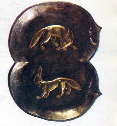 唐代双狐桃形鎏金银盘。