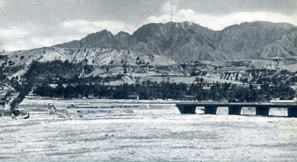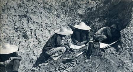 中国科学院古脊椎动物与古人类研究所所长杨钟健和蓝田现场会议的人员在蓝田猿人头骨发现现场参观。
