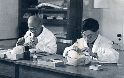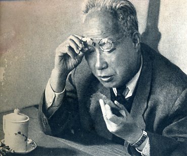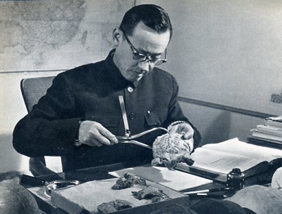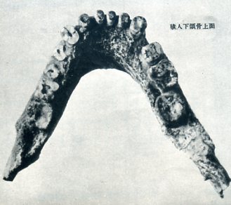 中国科学院古脊椎动物与古人类研究所所长杨锺健在观察猿人下颌骨。