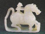 玉仙人奔马。1966年出土于咸阳汉昭帝平陵东北的汉代遗址中,高7厘米、长8.9厘米。一羽裳仙人骑一匹有翼天马,奔腾于云朵之上。玉色白润,是西汉玉雕精品。
