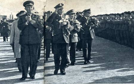 应我国国务院副总理兼中国人民解放军总参谋长罗瑞卿大将的邀请,柬埔寨王国军事代表团由柬埔寨王国政府副首相、国防大臣兼王家武装部队总参谋长朗诺中将率领,三月十三日到达北京。图为朗诺中将(前排,右)由罗瑞卿大将陪同,在机场受到中国人民解放军官兵的热烈欢迎。(1964年)