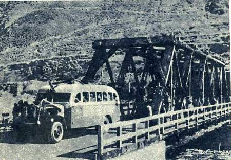 联接川西平原和四川北藏族自治区的成(都)阿(坝)公路理县薛城镇到山脚坝段,已于2月中旬通车。悬旗结彩的汽车正在通过理县日底寨大桥。(1954年)
