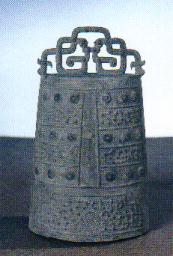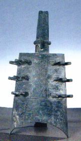 牟托K1甬钟。高52厘米。春秋战国之际,在这一带曾存在过一个以石棺葬为主要特征的小国。其来源据说来自甘青草原氐羌族的一个支系。近来在其相当国王一级的大型墓内发现了大小三镈,在墓室盖板上发现了一件甬钟,在墓外随葬物坑内发现了镈钟与甬钟各一件。甬钟的特征是:钟体修长,钟口呈弧形,正面有纹饰,背面光素无纹,或钟体两面纹饰不同。