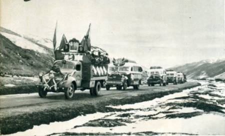 贯穿四川省西北部藏族自治区的成(都)阿(坝)公路在11月10日全线通车后,这一偏僻的地区已和四川省中部密切地联系起来。公路全长450多公里。(1955年)