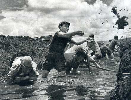 瓦切公社的干部和社员发扬红军长征过草地的革命精神,改造日根沼泽地。