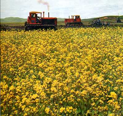 在海拔三千四百多米的高寒草地,试种油菜获得亩产一百五十斤油菜籽的好收成。这是丰收在望的油菜。