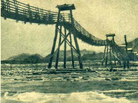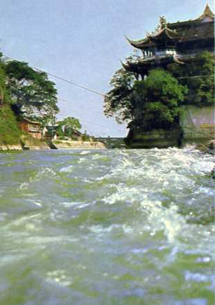 都江堰的竹索(安兰索桥),是岷江两岸的交通孔道,用大竹索做成,竹索粗约6寸,9条平列,长约1华里。竹索桥下边便是“分水鱼嘴”。