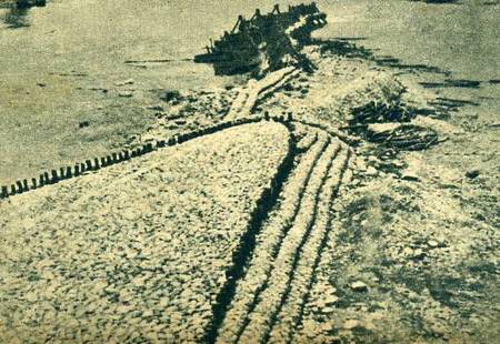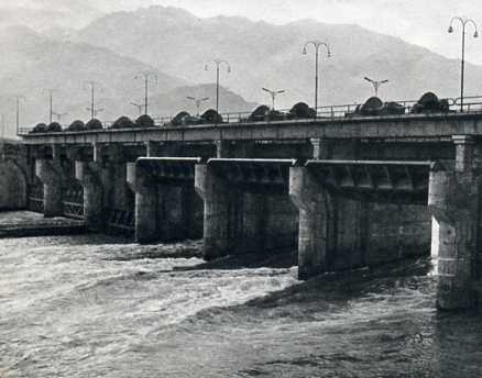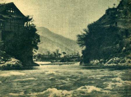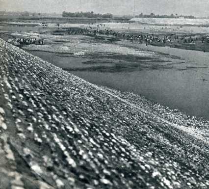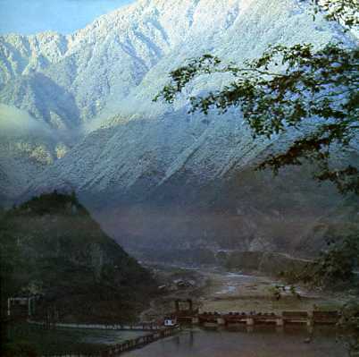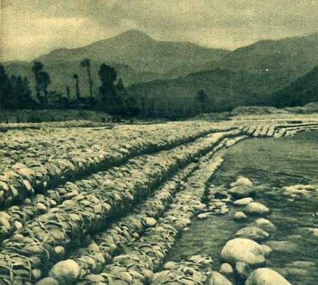 都江堰的分水鱼嘴,系用块石砌成的分水堤埂,把岷江分成“内江”和“外江”。因它的形状像鱼,所以叫做“鱼嘴”,是都江堰最重要建筑物之一。图上部系“内江”开流后所留“杩槎”的一部。
