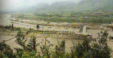 飞沙堰位置在“鱼嘴”以下,“离堆”(实瓶口)以上,是竹笼装卵石砌成之埂。堰顶有一定的高度。它作用是:洪水时期,“内江”过量之水潜到“外江”,以免水患;春天低水时期能保持“内江”一定的水量。