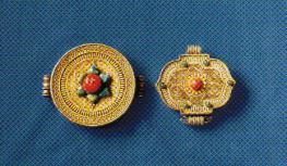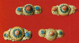 藏族女子头饰。饰于发辫之上,錾花并镶嵌珊瑚、松石,精巧华丽。