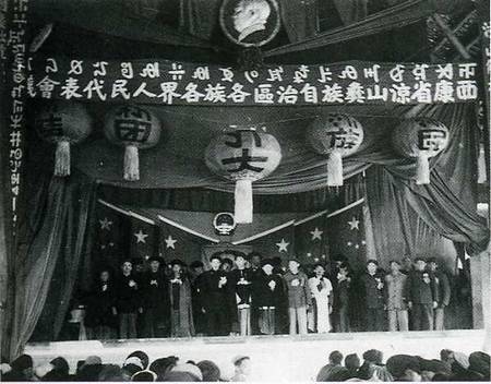 图为在西康省凉山彝族自治区各族各界人民代表会议上,当选的自治区政府委员在掌声中登台就职。(1952年)