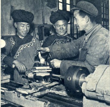 自治州在1958年建立了450多个地方国营厂矿,现在正加紧培养彝族技工。这是汉族老工人杨梦南指导彝族青年里比尔古(中)和什里木日掌握车工技术。