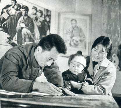 画家阿来郁正在创作一幅木刻。旁边是他的妻子和孩子。