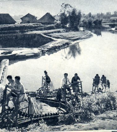 营山县新生农业社用一百多架水车来扩大双季稻的水源。(1957年)