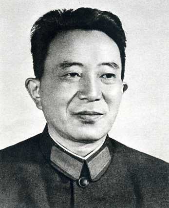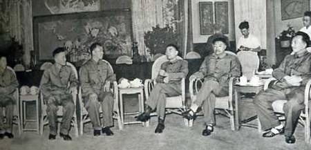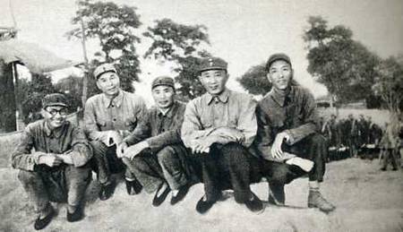 一九四七年,中国人民解放军十九兵团成立时,罗瑞卿政治委员(右二)、杨得志司令员(右三)、耿飚参谋长(右一)等一起合影。