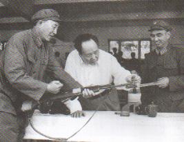 1964年6月,罗瑞卿总参谋长(左)陪同毛主席检阅北京和济南军区军事训练。图为罗总长向毛主席介绍我国自制的步枪性能。右为北京军区司令员杨勇。