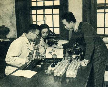 海洋学家朱树屏(右)、山东大学生物系教授李冠国(左)工作人员共同研究浮游生物分析工作中的问题。