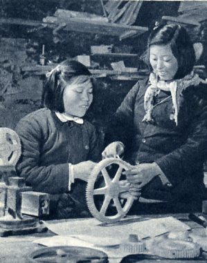 不久前还是农民的王秀亭(左)和王秀勤学会了制造纺纱用的木质模型。