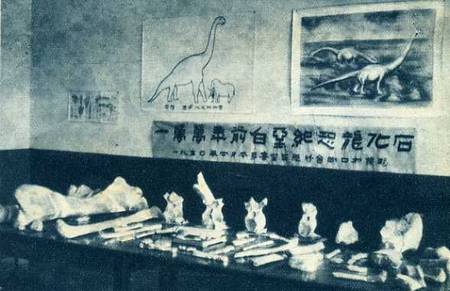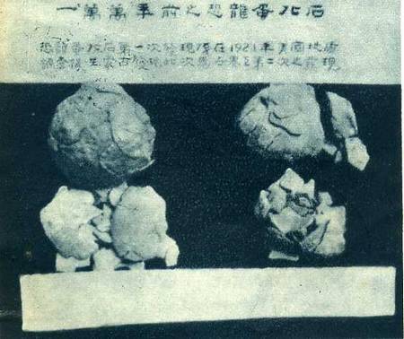 山东大学地矿系二、三、四年级师生10余人,今年4月上旬赴莱阳一带作野外调查实习时,在莱阳南15公里的金刚口村西沟“中生代”“上白垩纪”“王氏系”“红土层”内发现了恐龙的化石,又在金刚口北7公里的将军顶附近的同一“红土层”内,发现了恐龙蛋的化石,这一发现给古生物科学研究方面,提供了有价值的贡献。图为恐龙化石。