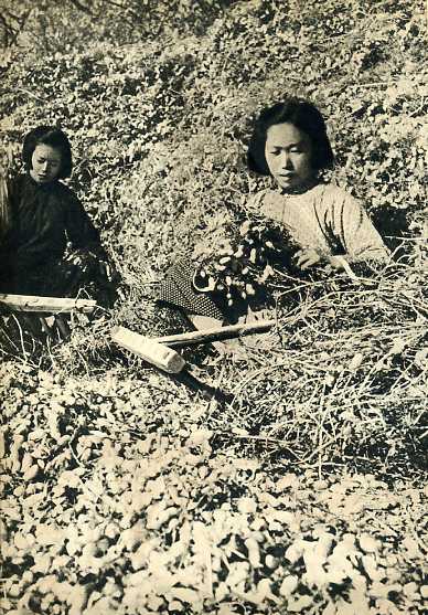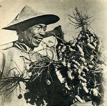 莱阳县北院村农业生产合作社的女社员正在收摘刨出来的新花生。