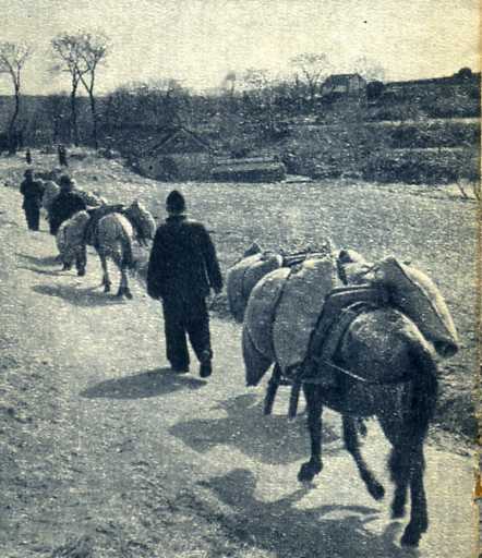 社员田方(左)从供销合作社的信货部贷了一部分钱,凑上他原来的积蓄,买了一头驴。