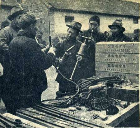 山东省莱阳县南西留联村供销合作社的农具供应站上陈列着肥田粉、喷雾器和各种手工业农具的样品,供农民们选购。