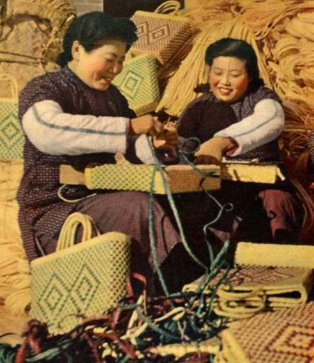 山东省掖南县(今莱州)一个辫业加工生产合作社的一部分女社员正在编草提篮。这种美丽的草帽辫的成品,已受到广大人民的喜爱。(1953年)