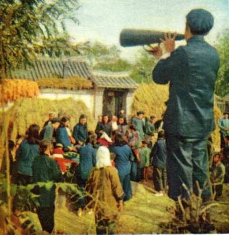 “送货下乡”小组的王宝仁用话筒向农民介绍货品。