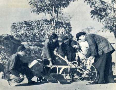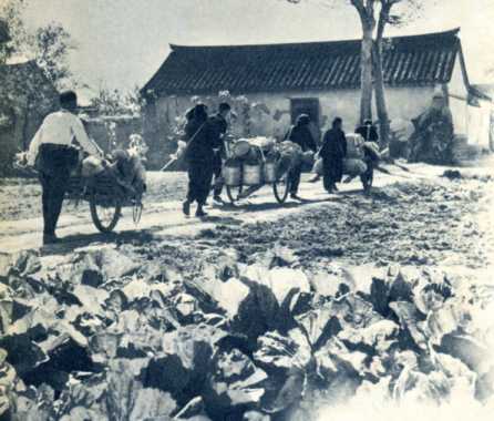 “送货下乡”小组把农业社订购的喂牲口的豆饼送来了。