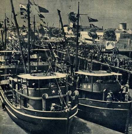 华东区是全国渔产最多的区域。解放后,全区的渔业在人民政府大力扶持与统一领导下,贯彻了以恢复为主的方针。1950年全区捕鱼总数即达440、450吨,比1946年产量超过百分七十,今年将完成50万砘的任务,并估计在1952年底可达到战前最高生产水平—73万吨。解放后华东区国营上海水产公司机轮首次出海,群众在岸上热烈欢送。